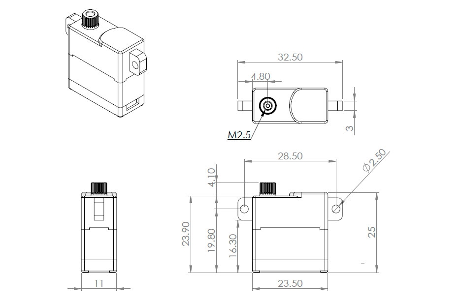 Ultra silné tenké digitální mikroservo 16,4g s kovovými převody s napájecím napětím 4,8-8,4V, 2xsamomazné ložisko. Ideální do křídel pro větroně a motorové modely. Tah 6,3kg.cm, rychlost 0,274s/60° při 4,8V, tah 8,2kg.cm, rychlost 0,190s/60° při 6,0V, tah 9,8kg.cm, rychlost 0,176s/60° při 7,4V, tah 10,9kg.cm, rychlost 0,159s/60° při 8,2V. Rozměry 23,5x11x25mm, hmotnost 16,4g. Hliníková krabička pro dokonalé chlazení s patkami pro montáž na plocho. Není programovatelné.