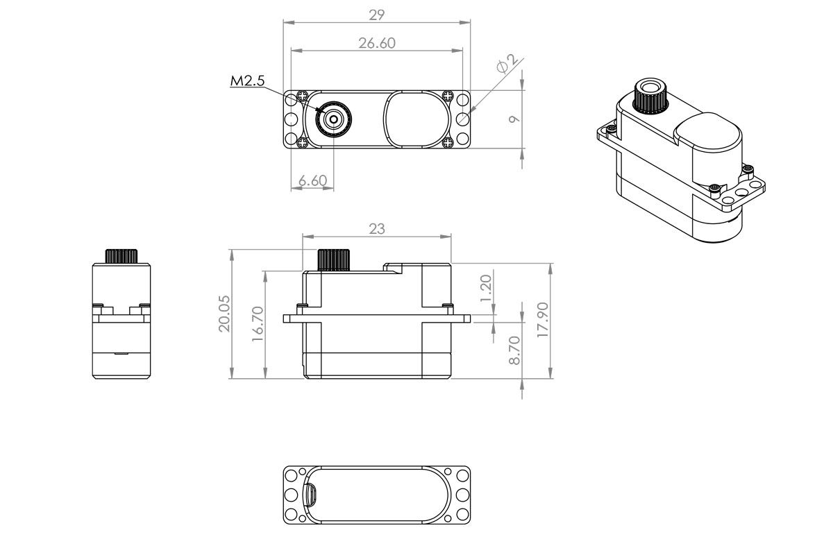 Silné tenké digitální mikroservo 7,5g s kovovými převody s rozsahem napájecího napětí 3,7-6,0V, 1xBB. Ideální pro RC házedla F3K, malé větroně a motorové modely. Tah 1,6kg.cm, rychlost 0,22s/60° při 3,7V, tah 2,0kg.cm, rychlost 0,16s/60° při 4,8V, tah 2,4kg.cm, rychlost 0,13s/60° při 6,0V. Rozměry 23x9x16,7mm, hmotnost 7,5g. Hliníková krabička pro dokonalé chlazení s patkami pro montáž na plocho. Není programovatelné.