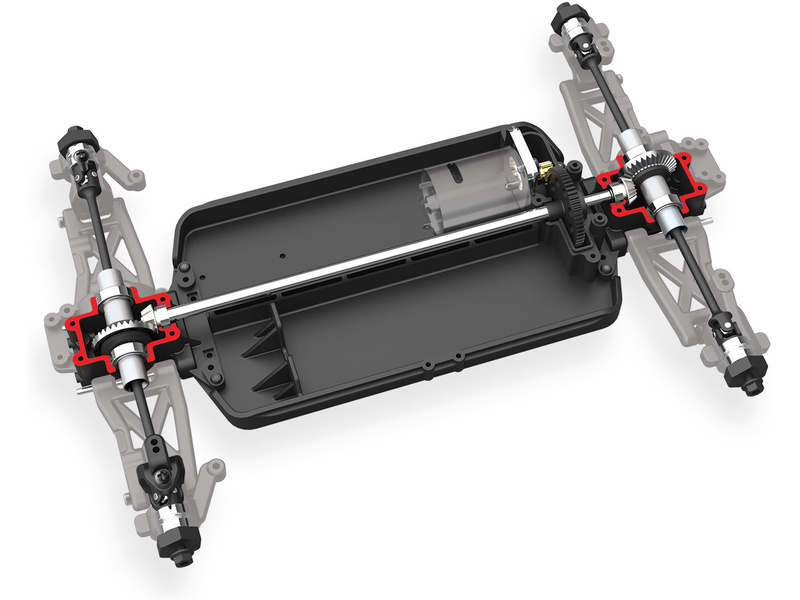 Stejně jako u skutečných auta i u tohoto RC modelu je použit přední diferenciál, který rozděluje točivý moment mezi kola a dovoluje rozdílné otáčky na předních kolech při průjezdu zatáčkou. Tím je jízda plynulá a autíčko má výborné jízdní vlastnosti. Pro perfektní distribuci výkonu je model vybaven i zadním diferenciálem. Diferenciály jsou pro odolnost vybaveny kovovými převody.